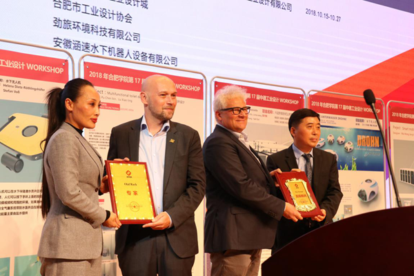 合肥学院2018年第17届中德工业设计WORKSHOP项目于10月16日启动,今天正式完成全部项目陈述汇报,活动历时两周,圆满结束。本届中德工业设计WORKSHOP设计项目由中国(合肥)工业设计城中工经信投资发展有限公司提供,分别为“安徽涵速水下无人机项目”和“劲旅智能公厕项目”。最终在合肥学院、德国马格德堡应用科学大学、中国(合肥)工业设计城,校企3方、5个设计小组、56名中德师生、企业设计师共同协作下,创意、创新完成设计方案13套。现场,谢海涛教授与王正荣总裁为提斯·克鲁格(Thies Krueger)、奥拉夫·瑞克两位教授颁发合肥市工业设计协会专家顾问证书。两位教授的加入,充实了合肥市工业设计协会专家顾问委员会的力量,也是合肥市工业设计产业开放融合发展的重要体现。