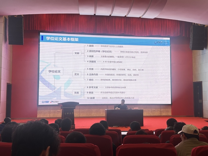 研究生处副处长高大明在致辞中表示,活动旨在增强校园学术氛围,提升我校研究生的学术素养和科研能力。首场讲座上,知网工程师王银杏以《知网AI与DeepSeek协同——重构学术创新生态》为题展开深度分享。报告内容围绕学术论文写作的体系化建构、AI技术驱动的科研新生态、知网资源的高效利用策略逐一展开,重点从科研论文选题的精准定位切入,强调“问题意识”是学术创新的起点,并演示了知网AI与DeepSeek技术的协同应用场景和系统梳理知网总库的分类检索技巧。在互动环节,与会师生就算法透明度、学科特异性模型开发等议题展开热烈讨论。