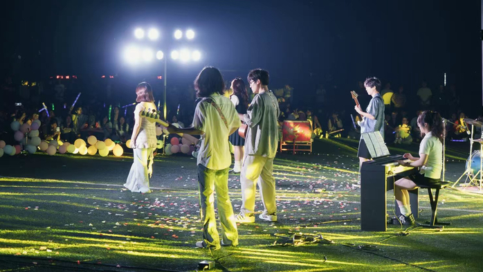随着第一缕吉他声响起,音乐节在欢呼声中拉开帷幕。流行摇滚、民谣弹唱、阿卡贝拉等多元音乐形式轮番登场。学生乐队的原创曲目《夏日来信》用动感节奏点燃全场,师生合唱的《夜空中最亮的星》,温柔旋律中闪烁着温暖共鸣。数千名观众手持荧光棒,随音乐节奏挥舞出层层“光浪”,将现场气氛推向高潮。当压轴曲目《明天会更好》响起,细碎的光斑与空中纸花交织,为这场音乐聚会画上句点。