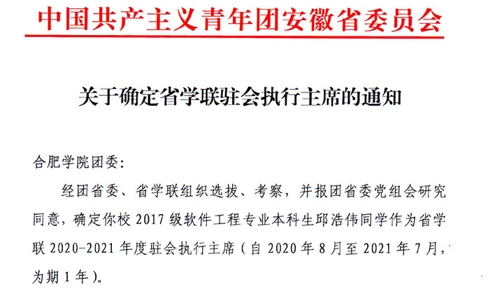 按照《安徽省学生联合会章程》有关规定,团省委、省学联于6月启动2020-2021年度省学联驻会执行主席的遴选工作。经过团省委、省学联组织选拔、考察并报团省委党组会研究同意,邱浩伟同学从安徽省各高校候选人中脱颖而出,当选为安徽省学联2020-2021年度驻会执行主席,这也是我校学生首次当选省学联驻会执行主席。