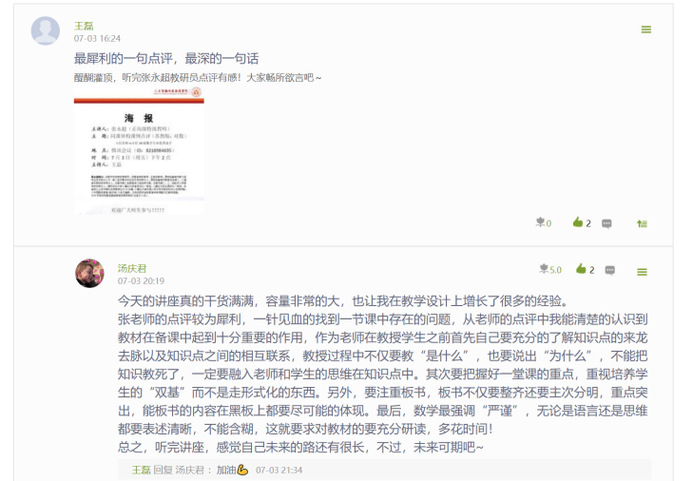 线上见习效果好不好,还得学生说了算。在7月3日合肥市教育局正高级特级教师张永超老师持续时长3个小时的关于“对数”的课题点评讲座后,18数学赵强同学在学习通平台写下了长达1600字的感言:“首先真的很感谢有这样一个与名师线上对面的机会,张永超老师在昨日花费了近三小时的宝贵时间给我们带来的讲座,这场探讨交流课不得不用精彩去形容,如果再加一个字,那就是很精彩!听完张老师就对数概念这堂课从而深入的数学思想、数学方法和数学精神都颇具特色,他用他独特的视角与方式……”。