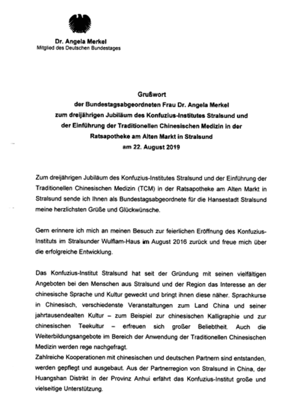 Das Konfuzius-Institut Stralsund feierte vor kurzem sein dreijähriges Jubiläum. Dazu richtete Bundeskanzlerin Angela Merkel ihr Grußwort. Sie sagte, dass das Konfuzius-Institut Stralsund seit seiner Eröffnung viele Sprachkurse und kulturelle Veranstaltungen für die Bewohner vor Ort und in der Umgebung angeboten habe, die sich für die chinesische Kultur und Sprache interessieren würden.