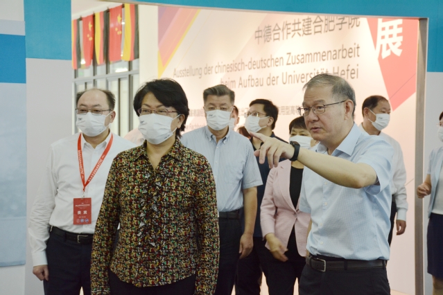 Während des Besuchs der Ausstellung über die chinesisch-deutsche Zusammenarbeit beim Bau der Universität Hefei hörten Weng Tiehui und ihre Delegation Wang Qidongs Einführung in die Geschichte der Gründung der Universität Hefei, der Bildungs- und Unterrichtsreform, den internationalen Austausch und die Zusammenarbeit sowie der Integration von Produktion und Bildung an. Weng Tiehui würdigte die Praxis der „Einrichtung von Studiengängen anhand des gesellschaftlichen Bedarfs“ und bestätigte die die Leistungen einer anwendungsorientierten Hochschulbildung auf hohem Niveau.