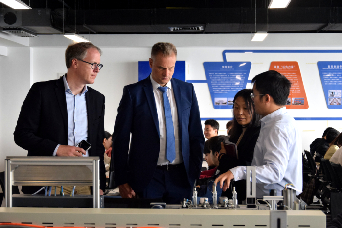 王其东陪同亚历山大·施梅曼一行深入能源材料与化工学院和大众学院,调研先进电池关键材料与技术重点实验室、大众学院校企培训中心与校企实训中心、大众学院产教融合平台实验室。