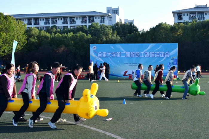 本次趣味运动会项目丰富多彩,在“运动火炬”项目中,参赛教师配合默契,动作流畅,展现出高度的团队协作精神;“步步高升”比赛中,大家紧握绳索,高效堆叠充气方块,每一次“升高”都凝结着集体的智慧与力量;“俄罗斯方块”环节,教师们迅速判断、精准拼合,思维的活力在运动中迸发;“同心协力”项目中,各队步伐一致、携手前行,用整齐的动作诠释了团结的内涵。