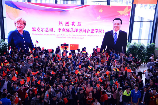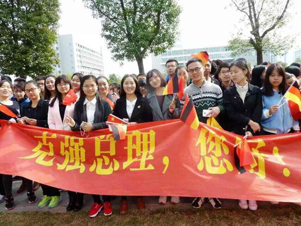 10月30日上午,秋意渐浓,但合肥学院数千名师生却热情高涨,难掩兴奋,大家举着中德两国国旗和精心准备的欢迎标语,夹道欢迎总理的到来。两国总理走近人群,与师生们握手并亲切交谈,在场学生纷纷表示,“总理十分热情,我还和总理握了手,感觉总理非常亲切,这是我最珍贵的记忆。”李克强总理亲切地与管理系王晓艳老师交谈,王晓艳向总理介绍了合肥学院中德合作专业的老师和学生。总理看到同学们高举的欢迎语并向大家表示问候,2013级物流管理专业的程奇峰同学难掩心中激动,说:“终于等到您了,总理。”总理鼓励同学们,好好学习,将来事业有成。