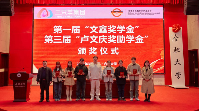 3月20日下午,第一届“文鑫奖学金”和第三届“卢文庆奖助学金”颁奖仪式在我校图书馆报告厅A厅举行。三只羊集团创始人兼董事卢文庆,我校副校长、安徽中德教育合作基金会理事长陈秀出席仪式,基金会办公室主任刘金平,人工智能与大数据学院院长余海峰,人工智能与大数据学院党委副书记、纪委书记姚蓓蓓,相关负责老师及获奖助学生等参加仪式。仪式由基金会秘书长何世昆主持。