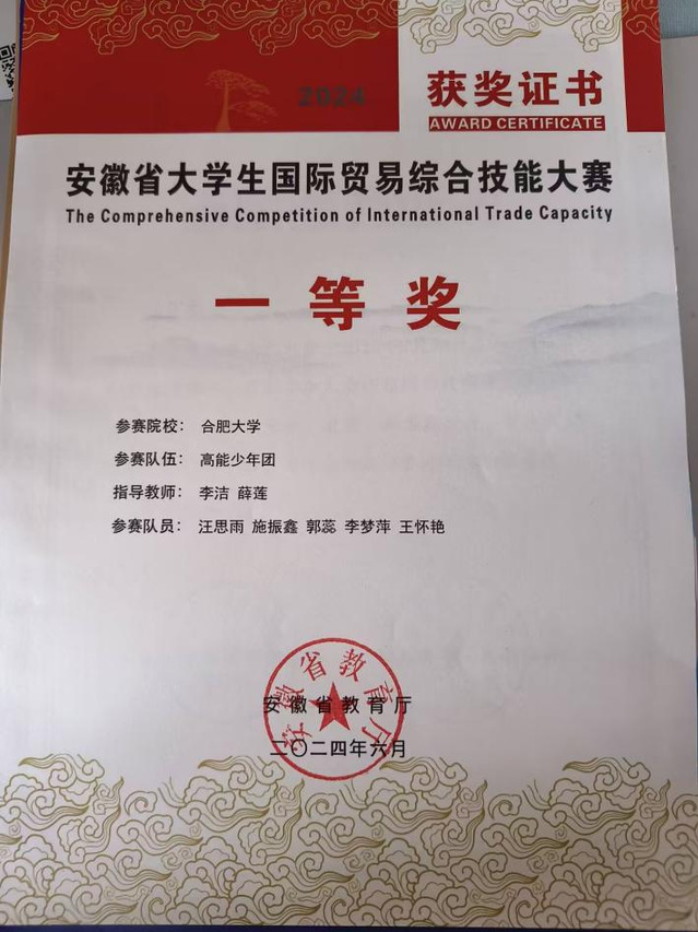 “千万击还坚劲,任尔东西南北风。”李梦萍深明大学时光蕴含的无限可能,为磨砺自我,她踊跃投身学科竞赛。其中令她铭记于心的经历,便是大二期间,她满怀着对国际贸易领域的憧憬与好奇,毅然决然报名参加了安徽省大学生国际贸易大赛。在备赛的日子里,她与团队成员们日夜不辍,查阅海量资料,深入了解国际贸易大赛与规则,精心策划方案,反复演练表演技巧。比赛当日,面对众多有备而来的对手,经过多轮激烈角逐,最终团队成功斩获省一等奖的殊荣。