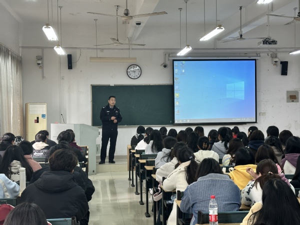 蒋勇警官根据刷单、贷款等诈骗手段,告诫我们要注意保护私人信息,接到可疑电话一定核对对方信息,如遇无法解决的问题时,及时与学校、派出所取得联系。针对常见诈骗话术里出现的情况,蒋警官介绍了公安机关处理违法事件的流程,提高了学生的判断能力。