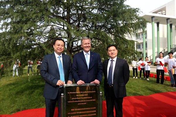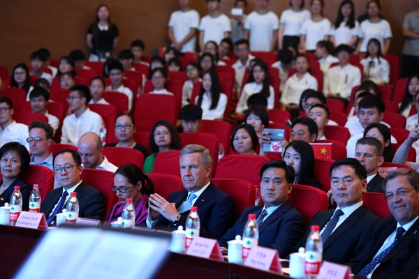 武尔夫主席在合肥学院发表主旨演讲。他深情回忆起第一次访华在学院时种下友谊树、2008年再次访华为友谊树浇水的情景,这也是他种下的第一颗友谊树。他回忆,第一次访问学校时,年轻人态度特别的积极,特别的热情,中国的青年想创造未来,对未来有非常多的期待,给他留下了非常深刻的印象。他在演讲中回顾了德国下萨克森州和安徽的合作历史,双方在农业、食品加工、机械制造和工业设计等领域开展的全方位合作,为中德交流打下坚实的基础。他引用李克强总理的比喻说,中德合作要像吃螃蟹那样,用智慧、技术和耐心把“螃蟹”吃干净,不能吃一口就算了。因此,德国和中国的交流还有很多领域可以携手,可以互相借鉴的地方非常之多,双方可以在新的丝绸之路上加强交流与合作,开创辉煌的未来。