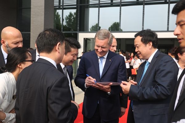 合肥学院党委书记蔡敬民为武尔夫主席颁发了合肥学院“荣誉教授”聘书,武尔夫主席为中德教育合作示范基地六大平台之一的“中德青年创业孵化中心”揭牌,全球中小企业联盟秘书长曹方、中国人民对外友好协会亚欧部部长沈昕、安徽省教育厅厅长李和平、安徽省人民政府外事办公室副主任张力芳等陪同揭牌。他们共同见证了蔡敬民与全球中小企业联盟秘书长曹方先签署双方战略合作协议,同时也见证了全球中小企业联盟秘书长曹方与全球中小企业联盟德国、瑞士、奥地利区执行主席迈克尔·皮茨签署全球中小企业联盟欧洲办公室协议。