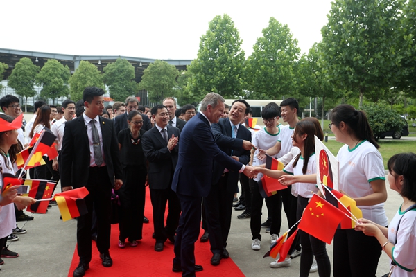 6月19日下午,充满热情和期盼的学生们站立在合肥学院图书馆报告厅大门两侧,手持中德两国国旗热烈欢迎武尔夫先生的再次到来。一路上,武尔夫主席多次驻足与师生代表亲切交流。