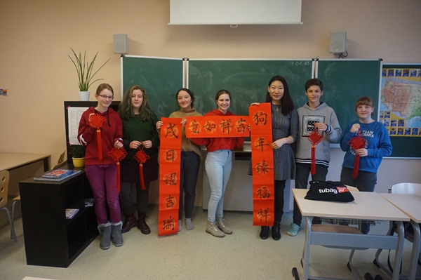 元月二十四日、二十九日和三十一日德国施特拉尔松孔子学院分别在其开设中文课程的施特拉尔松德汉萨文理中学,格赖夫斯瓦尔德蒙特苏里文理中学以及洪堡文理中学举办了丰富多彩的迎新年、庆春节文化体验活动。为了使学生们对中国的春节有直观的感性认识,孔院老师带去了新书写的对联、大红的“福”字和中国结,并详细解释其各自的文化含义。学生们对这些富含文化元素的物品充满了兴趣,纷纷赞叹其独特与神奇。孔院老师们“趁热打铁”,教同学们尝试写毛笔字,在古老的汉字艺术中体味传统文化的韵味。最后大家一边品尝着孔院老师带来的中国糖果,一边观赏传统动画片《大闹天宫》,在欢乐的氛围中结束了新鲜有趣的、喜迎春节的文化之旅。