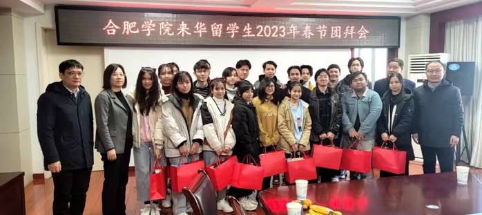 院长吴春梅出席一年一度的国际学生春节团拜会并讲话。吴春梅表示,国际化是学校办学定位之一,学校将持续加强国际交流合作和国际学生培养工作,希望大家努力学习,在合肥学院成长成材。两名柬埔寨学生和一名尼泊尔学生代表分享了在中国学习、生活点滴以及未来的目标规划,向学校给予他们的关心和帮助表达了诚挚的感谢。现场,吴春梅为国际学生派发新春礼包,并与他们亲切交谈,详细了解他们的学习生活情况,鼓励他们学习中国文化。团拜会气氛热闹融洽,在欢声笑语中让国际学生感受到家一般的温暖。