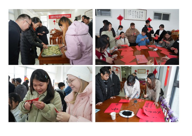 Students from Cambodia, Laos, Nepal and Russia, made Jiaozi (dumplings), wrote blessing character Fu in calligraphy and made paper-cutting together with teachers to deliver New Year wishes, which turned the dining hall into a place full of great joy.