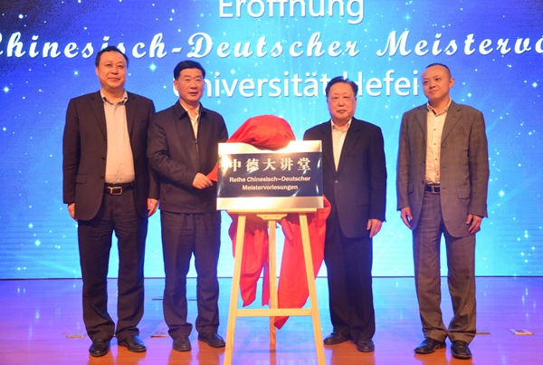 讲座结束后,梅兆荣、庆承松、蔡敬民及秦俊峰四人为“中德大讲堂”揭牌。