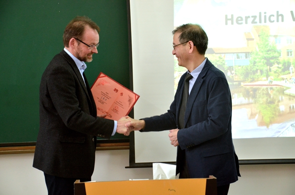 王其东首先回顾了合肥学院中德合作历程,他从合肥学院中德教育合作示范基地建设的背景介绍了我校的情况,从人才培养、服务社会的角度介绍了“双元制”项目。他表示,中德教育合作示范基地得到省政府和市政府的重视,并被列入安徽省十三五规划中。学校在人才培养方面应该以人为中心,奖学金的设立有利于调动学生学习实践的主动性和积极性,希望能与大陆公司建立长期的合作关系。