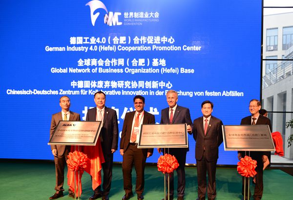仪式上,武尔夫、曹方、纳赛尔、毛存光、蔡敬民、王其东共同为中德先进制造业(合肥)合作促进中心、全球商会合作网基地、中德固体废弃物研究协同创新中心揭牌。合肥学院教师陶莉向武尔夫赠送由其创作的中国传统艺术品团扇。