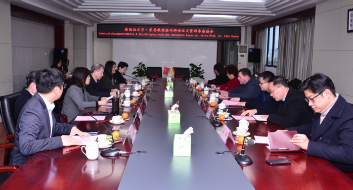 2月10日上午,我校在行政楼九楼东会议室举办外籍教授聘任仪式暨新春座谈会,来自德国汉诺威应用科学大学的法尔克·霍恩受聘为学校外籍教授。党委书记王其东、院长吴春梅出席仪式,组织部、教务处、人事处、国际交流合作处、研究生处、设计学院、外国语学院等相关单位负责人参加仪式。王其东给霍恩教授颁发聘书,人事处处长纪平代表学校与霍恩教授签订聘任协议。