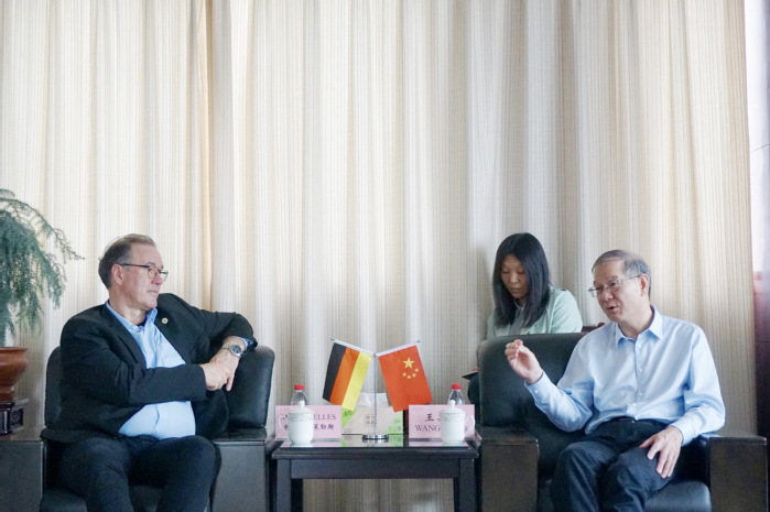 王其东对莱勒斯的来访表示热烈欢迎,他详细介绍了学校近三年来在学科建设及专业发展方面的进展,希望学校与罗斯托克大学在生物质利用及研究领域的合作能做实做强。