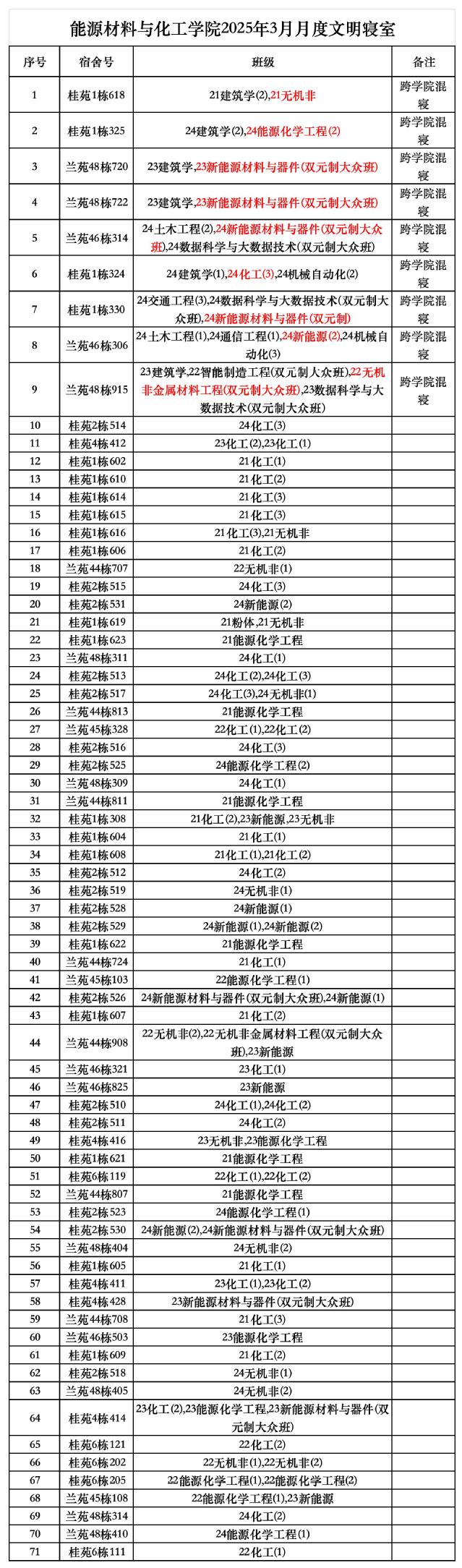 能源材料与化工学院2025年3月学生文明宿舍结果公示