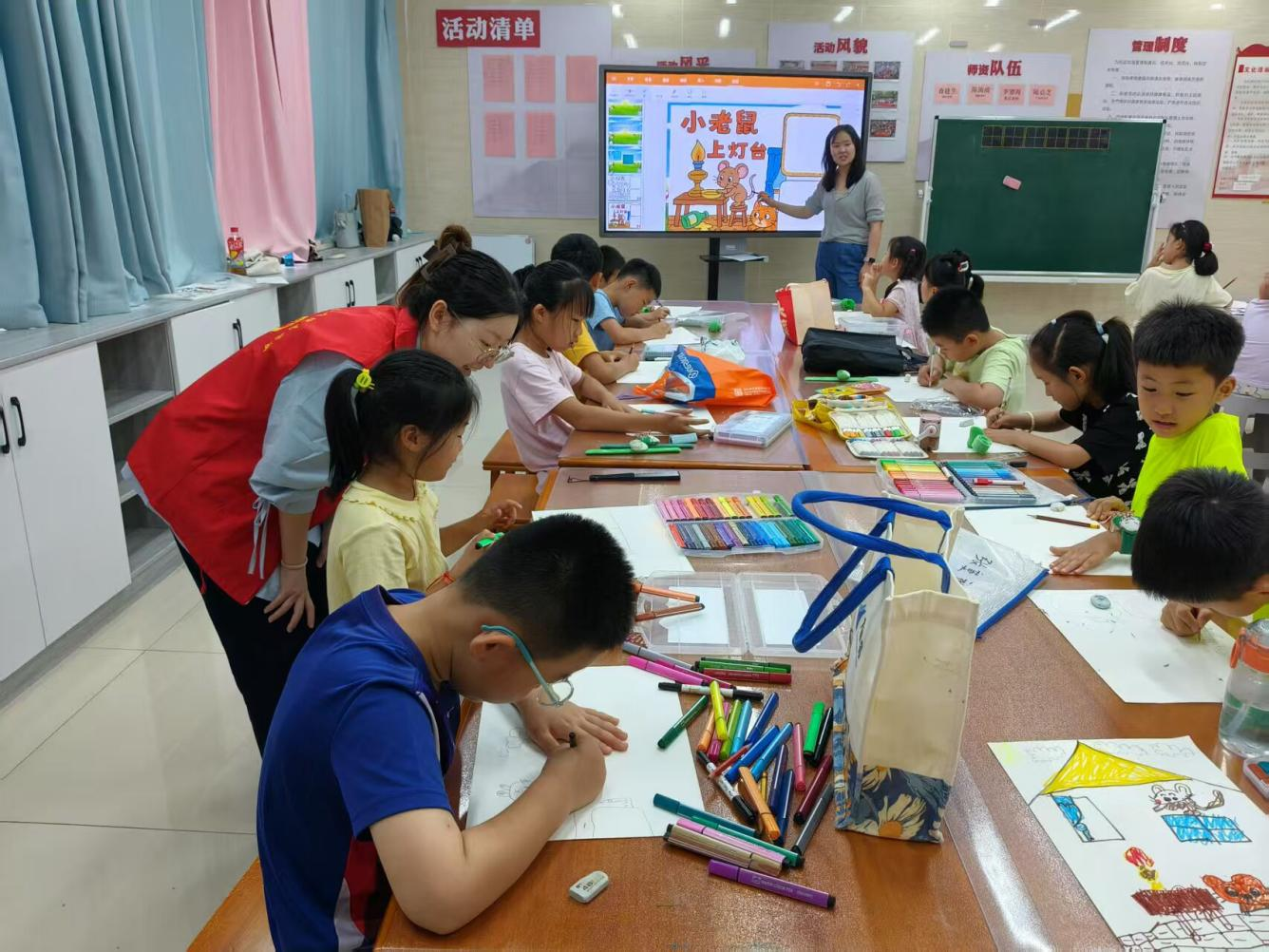 在此次活动中,志愿者们承担了重要的辅导工作,协助书法老师和美术老师开展教学活动。他们耐心地为孩子们讲解书法的笔画结构和运笔技巧,孩子们引导感受汉字的魅力。在美术课堂上,志愿者们帮助孩子们发挥想象力,用画笔描绘出心中的美好世界。通过志愿者们的悉心辅导,孩子们的学习热情被充分激发,课堂氛围活跃而欢快。