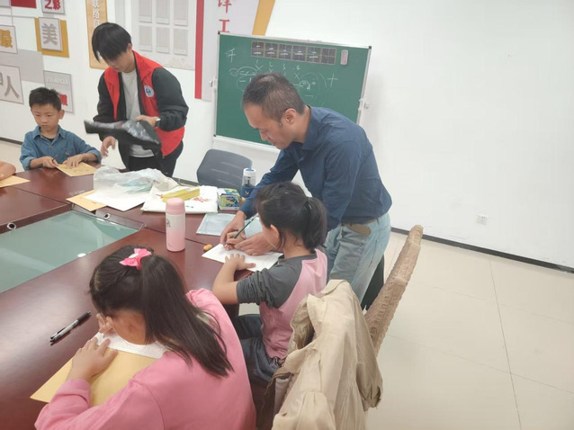 活动伊始,志愿者们在社区教室内有序引导孩子们完成签到,细致确认每位学员的到场情况,确保课堂准备工作井然有序。课堂进行中,他们主动承担起辅助教学的职责:时而轻声提醒孩子们保持专注,维护课堂纪律;时而俯身与练习书法的孩子亲切交流,耐心解答他们的疑问,让轻松融洽的氛围贯穿课堂始终,助力教学活动有条不紊推进。