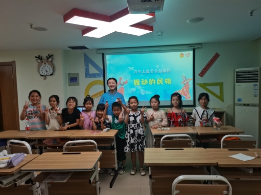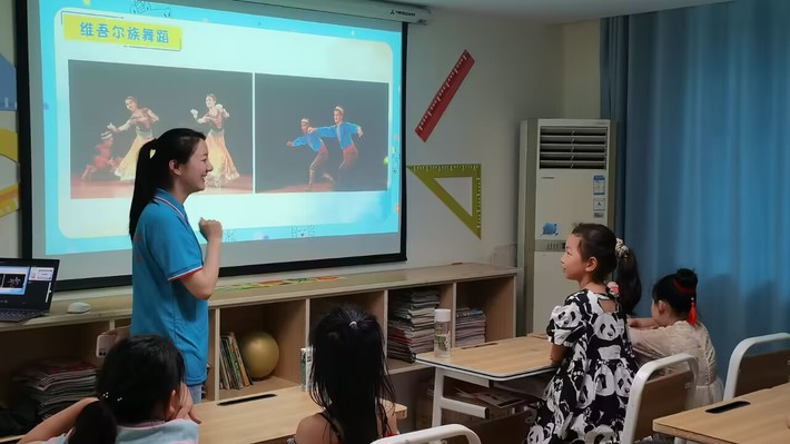 每个民族都有着属于自己的历史记忆和文化遗产,为传承发展民族舞蹈文化,加深小朋友们对中华民族多元文化的了解,让他们感受到民族舞蹈的魅力和艺术价值。7月3日中午,教育学院“七彩童年,‘育’你相伴”三下乡团队于滨湖和园社区进行了一堂生动有趣的舞蹈课。以“学习民族舞蹈”为主题,在小朋友中传承民族知识,培育中华民族一家亲的理念,使民族团结教育更加生动、丰富、精彩。本次课程的主讲教师为王玉,杨明月作为助教参与课程。 课程开始,老师在自我介绍后,亲切地询问同学们关于少数民族的知识,“你们知道我国有多少个民族吗?在座的各位有少数民族的同学吗?你们有去少数民族居住过的地方旅游吗?给你印象最深刻的是什么呢?”一个个问题不仅帮助老师进一步了解小朋友们的知识状态,也让他们对本次的课堂内容产生更浓厚的兴趣。在同学们的期待下,王老师“身临其境”地带领同学们前往中国各地“旅游”、“参观”少数民族的舞蹈,与同学讨论民族舞蹈的特色。