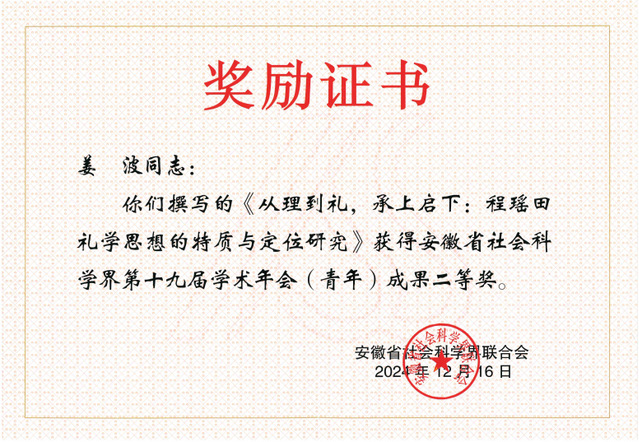 1227日至28日,由安徽省社科联和安徽财经大学主办,安徽省社科界青年学者协会、安徽财经大学社科联和蚌埠市社科联承办的安徽省社科界第五届青年学术论坛在蚌埠举行。省社科联和安徽财经大学领导,青年学者导师、青年主讲嘉宾和青年学者代表等近200人现场参加论坛,论坛全程线上直播。我院青年教师姜波提交的论文获得学术年会(青年)成果二等奖,并受邀作小组交流发言。