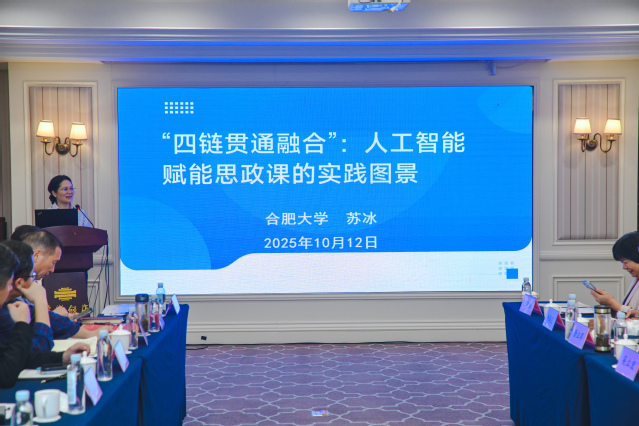 为深入推进大中小学思政课一体化建设,破解学段衔接难题、推动思政课改革创新,2025年10月12日,由安徽医科大学马克思主义学院、安徽省大中小学一体化思政理论课教材建设重点研究基地、安徽省大中小学思政课一体化共同体(合肥工业大学)共同主办的“思想领航·机制创新·数字赋能——大中小学思政课一体化建设研讨会”在安徽合肥以线上线下方式召开。来自部分高校的主管教学领导、教师及研究生代表齐聚合肥,围绕“大中小学思政课一体化建设”主题展开研讨。 我院鲁先瑾书记、王能引副教授受邀通过线上方式参加本次会议。苏冰院长以线下方式参会,并作题为《“四链贯通融合”:人工智能赋能思政课的实践图景》的大会发言。