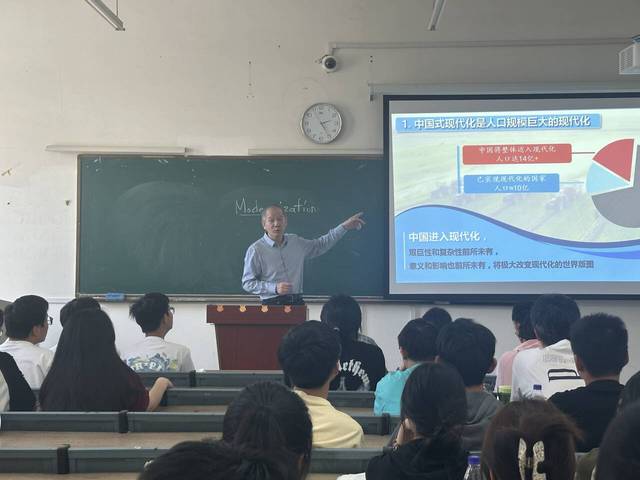 王书记首先从现代化的概念出发,介绍了中国式现代化的发展历程和基本特征。接着分析了我国迈向现代化新征程面临的战略机遇和风险挑战,就如何走稳走好中国式现代化道路,新时代怎样高质量发展等方面阐释了中国式现代化的丰富理论。最后,王书记告诉在场的同学们,中国式现代化走得通、行得稳,是强国建设、民族复兴的唯一正确道路,当代大学生生逢其时,迎来了实现抱负、施展才华的难得机遇,更肩负着全面推进强国建设、民族复兴伟业的时代重任。要切实增强历史责任感和使命感,怀抱梦想又踏实学习,奋力书写为中国式现代化挺膺担当的青春篇章。