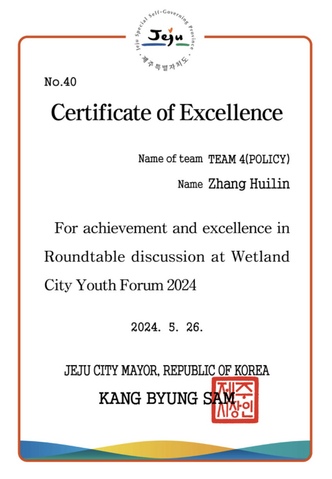 圆桌论坛从教育、文化、市民、政策和技术五个领域进行了热烈的讨论,与会者共同拟草了“倡导湿地可持续发展青年宣言”。张惠琳老师作为“政策”组代表进行小组汇报,内容包括制定政策推进湿地保护相关软件和技术的开发,加强湿地城市高校之间联系,推动大学生生态文明理论认知和践行的具体方法等。报告内容详实、逻辑清晰,获得了与会嘉宾一致好评。拉姆萨尔东亚区域中心主任徐承镐等4名专家一致决定授予“优秀提案奖”,济州市长姜秉杉为张惠琳授奖。