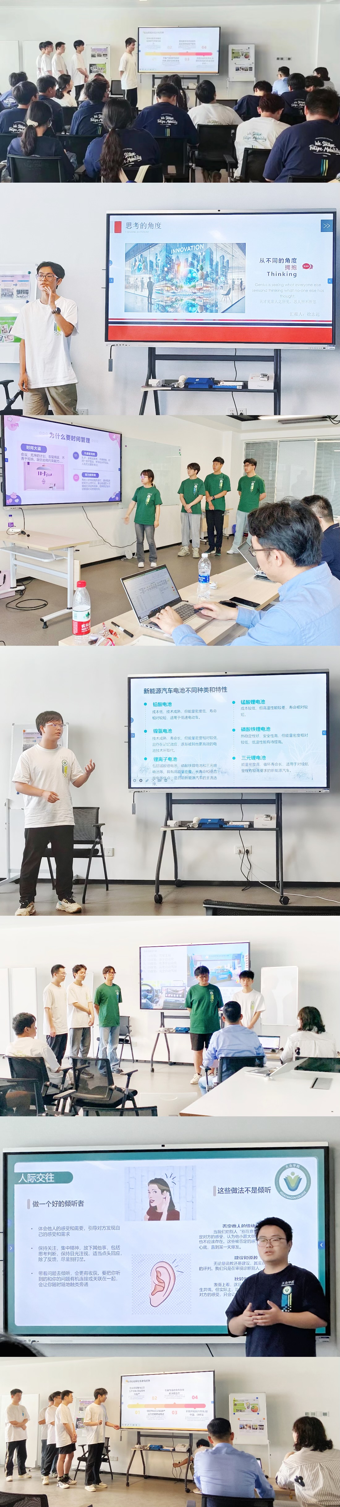本学期,同学们学习了大众汽车企业文化、大众汽车生产管理个人职业发展等大众企业课程,深入探索了大众集团企业文化及大众汽车生产管理各环节知识,学习了如何进行高效沟通和时间管理等软技能。同学们将这些知识整合,通过团队汇报展示的形式进行呈现分享。在本次汇报展示中,同学们从知识的接收者,变为知识的创造者和传播者。汇报主题涉及了从对创新型思维的理解到新能源汽车技术应用的广泛领域,每一个主题都体现了他们对知识广度和深度的独特理解。汇报不仅展示了学生个体的学习成就,更加凸显了团队合作的力量。