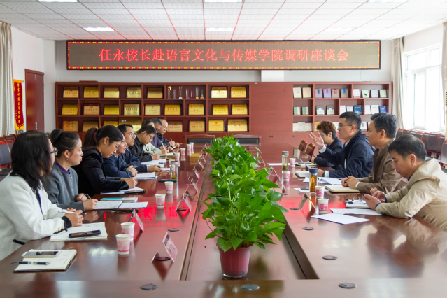 任永在认真听取汇报后,对语言文化与传媒学院近年来取得的成绩给予肯定,对学院发展的关键问题和重点任务进行了指导。他强调,语言文化与传媒学院一是要聚焦文传特色,充分发挥自身专业优势,在助力学校融媒体发展和培育学生人文素养上积极作为;二是要联动省内兄弟高校,整合资源,强化人文学科建设和科研工作跨校合作力度,推动形成发展合力;三是科学规划人才引进工作,注重学科背景和研究方向的一致性,努力打造省内有影响力的教学科研团队;四是积极拓展办学空间,不断提升学院硬件建设水平,为教师的教学和科研提供有力保障。
