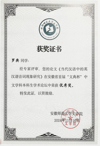 我院2021级汉语言文学专业罗典同学的论文《当代汉语中的英汉谐音词现象研究》受邀参加此次论坛,并荣获优秀奖。该论文由我院陈红燕老师指导,主要分析英汉谐音词增补、删除、替换及变异等构造手段,归纳典型特征,提取运作机制,总结积极贡献,指出负面影响。