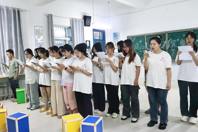 晚上六点半,在石板冲乡初级中学的音乐教室,实践团队的成员们进行了文艺表演合唱歌曲《如愿》的排练。教室里,大家拿着手中的歌词稿,一遍又一遍的练习,激情投入,饱含感情。首先跟随原唱的声音练习了两遍再听一遍原唱,最后跟着伴奏练习两次。歌词“山河无恙,烟火寻常”,不仅是整首歌的升华,也是成员们进行暑期“三下乡”社会实践活动的主题与目标,相信通过近几日不断地练习,在最后进行文艺演出时定能有出色的表现。