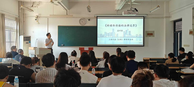 为加强课程内涵建设,进一步提升教学质量,9月16日上午,我院邀请上海汉盛(合肥)律师事务所孟祥磊律师来我院讲学,来自22级网络与新媒体专业的本科生和部分研究生到场聆听,魏修治老师主持。