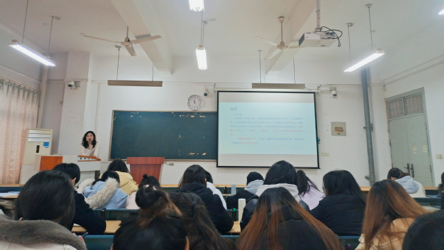 大会中,殷明明老师首先向大家介绍了毕业论文撰写的整个流程,包括选定指导老师,确定选题,提交开题报告,复审,抽查以及答辩等步骤。然后,殷明明老师给大家讲解了一些细节,比如查重比重、送至外审的比例等,要求大家诚信写作。之后,殷明明老师向大家强调了毕业实习的要求和纪律。