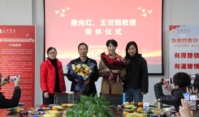 11月14日下午,语言文化与传媒学院在一期五栋二楼大会议室举行了2023年教职工荣休仪式,向2023年荣休的詹向红、王世朝两位教授表示感谢与祝福。学院领导班子成员、全体教职工参加仪式。