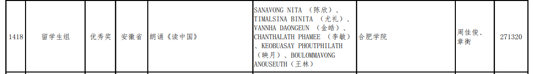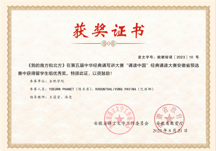 近日,由教育部、国家语委主办的第五届中华经典诵写讲大赛“诵读中国”经典诵读大赛已完成全部赛程,由我院教师周佳俊、章衡指导,尤礼(TIMALSINA BINITA)、陈欣(SANAVONG NITA)、金皓(VANNHA DAONGEUN)、李敏(CHANTHALATH PHAMEE)、映月(KEOBUASAY PHOUTPHILATH)、王林(BOULOMMAVONG ANOUSEUTH)六位留学生(均为我院留学生)共同诵读的作品《读中国》荣获安徽省三等奖及全国优秀奖;由我院教师王昌宜、汤尧老师指导,陈长苏(YOEURN PHANET)、巴丽娜(KHOUNTHALIVONG PAVINA)两位留学生共同诵读的作品《我的南方和北方》荣获安徽省优秀奖。