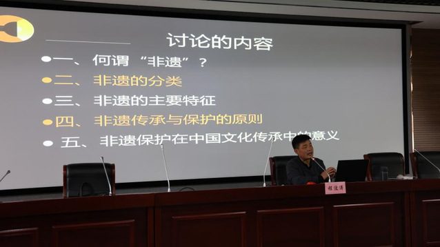 讲座围绕非遗文化的价值和传承意义展开,程教授用大量生动的案例和图片讲述“非遗”的由来、类别和特征,呈现“非遗”的独特魅力、保护原则和在中国文化传承中的意义,并结合自身经历,阐述非遗文化传承的重要性,提醒同学们传承非遗,时不我待。