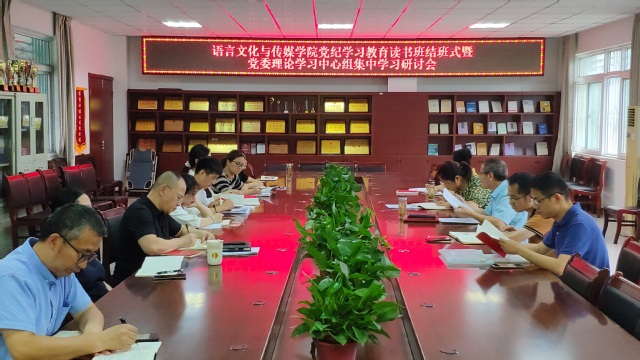 7月10日下午,语言文化与传媒学院在学院大会议室举行党纪学习教育读书班结班式暨党委理论学习中心组集中学习研讨会,学院领导班子成员、党委委员、纪委委员、科级干部及各党支部书记、系(中心)主任参加会议,会议由院党委书记储昭辉主持。