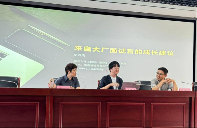 史亚风首先向同学们介绍了当下新兴产业和大型企业的部门设置、职位要求、用人标准,帮助即将毕业的大学生们了解和找准自己的行业赛道。随后,从自己担任面试官的视角史亚风和同学们分享了头部大厂面试经验,讲述在面试中关注的重点,强调实践背景获奖证书等在面试中的重要性。