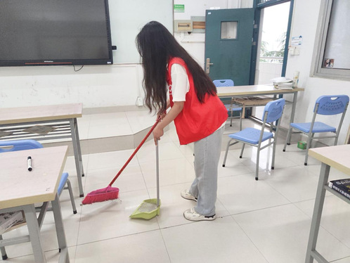 下午六点,志愿者们准时来到一期八栋教学楼对教室进行清扫。负责人布置了本次活动的具体任务并将志愿者们分成几个不同的小组,每组志愿者分工明确,负责对不同的区域进行打扫和清理。他们穿着统一的志愿者服装,手持扫帚、拖把和抹布,有条不紊地在教室内开展清洁工作。劳动过程中,每个人都积极参与,干劲十足,开始,着手,认真打扫地面、整理桌椅,对教室的每个角落都进行了仔细的清理,确保不留清洁盲区。在志愿者们的团结协作下,教学楼的教室面貌焕然一新,为师生们提供了一个更加舒适的学习环境。