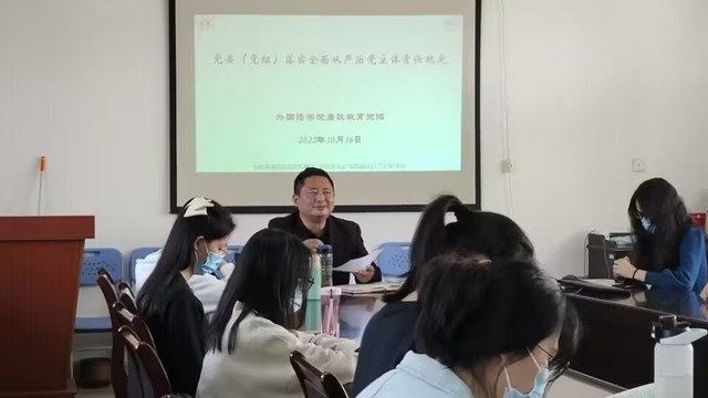 吴老师带领全体学生党员从总则、责任内容、责任落实、监督追责和附则五个方面认真学习了《党委(党组)落实全面从严治党主体责任规定》。吴老师强调,全体学生党员必须深入学习贯彻习近平新时代中国特色社会主义思想,深刻领悟“两个确立”的决定性意义,增强“四个意识”、坚定“四个自信”、做到“两个维护”,不忘初心、牢记使命,守责、负责、尽责。他指出,外国语学院的发展要坚决贯彻执行党中央决策部署和上级党组织决定,提高政治站位,彰显政治属性,强化政治引领,始终同党中央保持高度一致,聚焦立德树人根本任务,对学生充满友善与关爱,助力学生顺利成长为社会主义建设者和接班人。