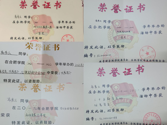 磋砣莫遗韶光老,人生惟有读书好。在整个大学过程中,高秀云成绩优秀,同时也参加了许多比赛,获得过不少奖项。她曾经获得了外研社杯阅读写作大赛二等奖,三等奖和第九届挑战杯大学生课外学术科技作品校级二等奖等;在班集体和校组织中她的表现也十分亮眼,是2021年度优秀团干和二十五期、二十六期青马班优秀学员。