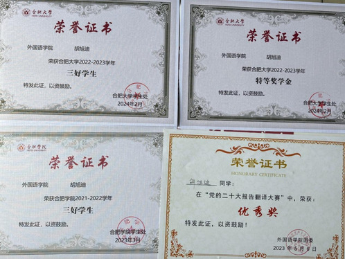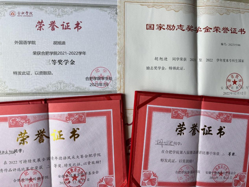 少年应有鸿鹄志,当骑骏马踏平川。胡旭迪不仅在考研方面取得成果,其竞赛成绩也很优异。在自身的努力和外国语学院老师们的指导下,胡旭迪在过去几年中屡次在学科类竞赛中斩获优异成绩。她曾获得2022年可持续发展全国青年德语风采大赛二等奖、合肥学院第八届演讲比赛二等奖,并且她还多次获得三好学生以及奖学金。通过这些奖项,胡旭迪同学不仅展示了自己的才华,也为学校争得了荣誉。她的表现也证明了外院学子不仅在学习上表现出色,更具备了全面发展的能力。我们期待她在未来的学习和生活中,能够继续发挥自己的优势,取得更好的成绩。