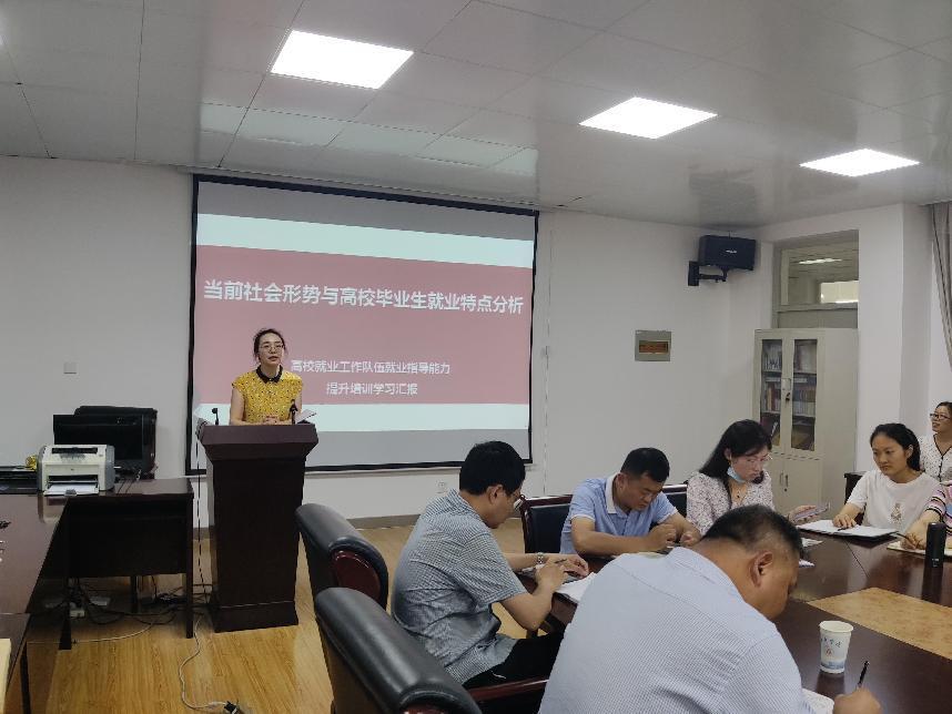 生物食品与环境学院党委副书记晋松向大家分享她参加高校就业工作队伍就业指导能力提升培训学习的心得体会,从当前社会形势与高校毕业生就业特点等方面进行分析,带领大家共同学习了社会环境因素导致就业面临的机遇与挑战、毕业生就业的十大特点、对就业热点现象的解释、对就业工作的启发等方面内容。