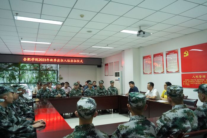 仪式上,张应杰宣读了合肥学院2023年秋季应征入伍毕业生名单,汇报了我校2023年度征兵工作的完成情况。随后拟应征入伍的2023届经济学专业毕业生孟现敏同学分享了自己参军报国的初心与理想,表达了对军营生活的向往,同时他感谢学校的国防教育,让他更加坚定从军理想。2023届自动化专业毕业生牛磊同学表示,作为学生党员,他将努力成长为一名有知识、有素养、有品德的新时代青年,用青春和汗水为祖国的繁荣富强和人民的幸福安康贡献自己的力量。