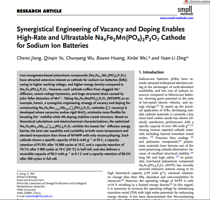 近日,我校生物食品与环境学院2022级资源与环境专业研究生蒋晨熙以第一作者在国际学术期刊《Small Methods》(IF=10.7,中科院二区)发表了题为“Synergistical Engineering of Vacancy and Doping Enables High-Rate and Ultrastable Na4Fe2Mn(PO4)2P2O7 Cathode for Sodium Ion Batteries”的研究论文。我校高级实验师卫新来、湖南大学教授丁元力为通讯作者,欧美黑人巨大videos精品_欧美黑人巨大xxxxx_欧美黑人乱大交_欧美黑人乱大交_欧美黑人牲交videossexeso_欧美黑人添添高潮a片www_欧美黑人添添高潮a片www_欧美黑人性暴力猛交喷水黑人巨大为第一完成单位。